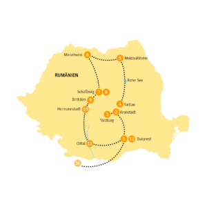 Am Morgen spazierst du durch die Stadt der Gegensätze: sozialistische Plattenbauten neben französischen Boulevards und restaurierten Altbaufassaden, von neoklassizistisch bis neobarock. Charmante Cafés, verwinkelte Altstadt-Gassen, doch plötzlich stehst du vor einem Märchenschloss, mitten in der Walachei. Eine Sommerresidenz des rumänischen Königshauses wie eine Kulisse für Prinzessinnenfilme! Vom weltlichen Glanz geläutert wirst du im Karpaten-Kloster Sinaia, bevor du das wunderschöne Kronstadt kennenlernst